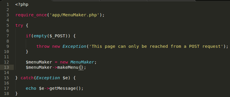 Since our app is so simple and we aren't using a framework, I just send the post request to a bootstrapper file. In this file, we throw an Exception if the post array is empty. If we have contents in the post array—meaning the user has filled out the form and hit submit—a new MenuMaker instance is instantiated, and we call it's makeMenu method.